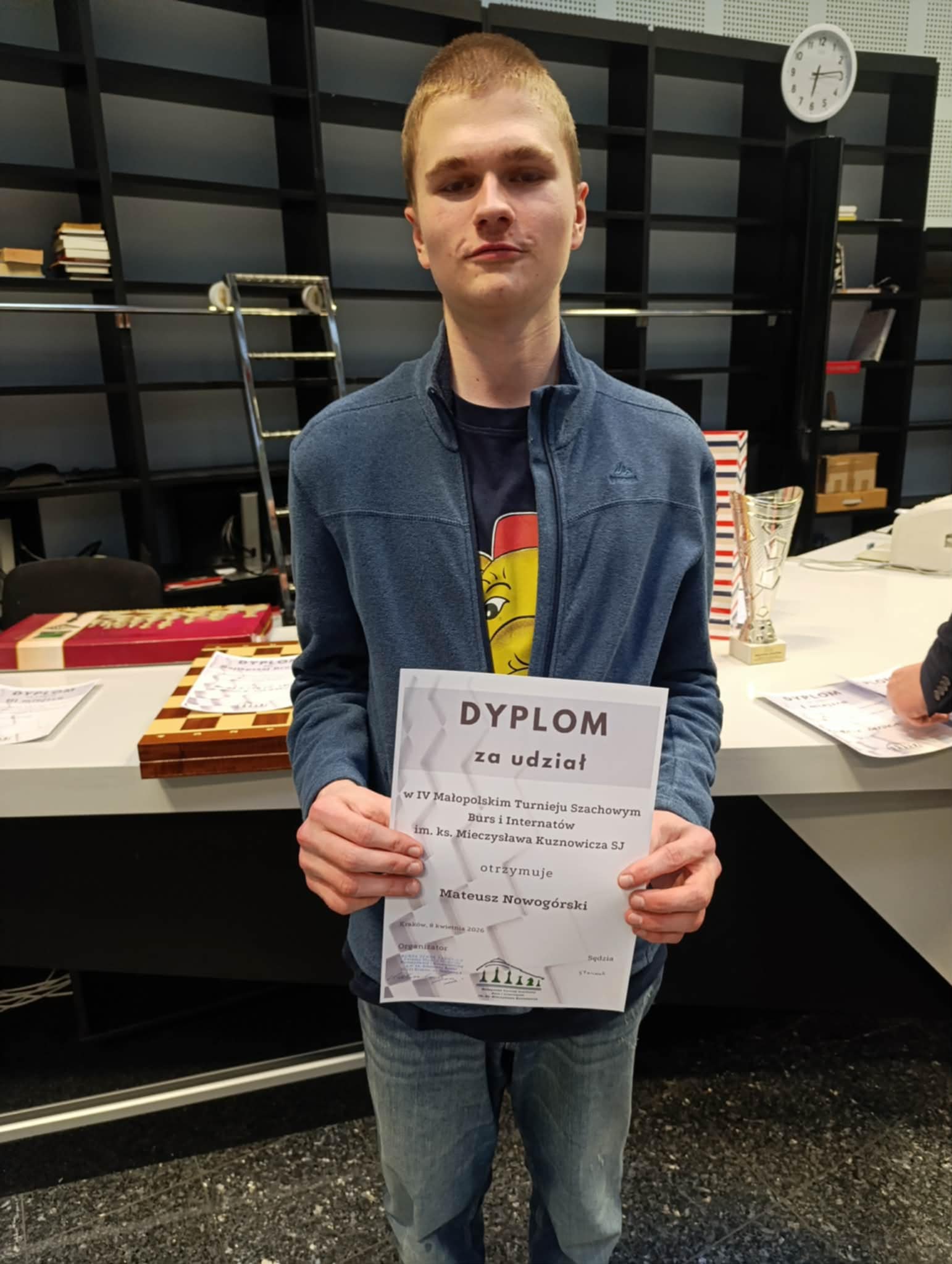W dniu 8 kwietnia 2026 r. odbył się IV Małopolski Turniej Szachowy Burs i Internatów w Bibliotece Uniwersytetu Ignatianum w Krakowie. Na turniej zgłosiło się 34 uczestników, którzy na co dzień są wychowankami burs i internatów w Krakowie, Nowym Sączu, Nowym Targu i Tarnowie. Naszą placówkę reprezentował Mateusz Nowogórski pod okiem wychowawcy Macieja Pallutha. Jak na debiutanta wypadł bardzo dobrze, gdyż ostatecznie zajął 12 miejsce. Gratulacje dla Mateusza. Wracamy na turniej za rok, by walczyć się o jeszcze lepszy wynik.